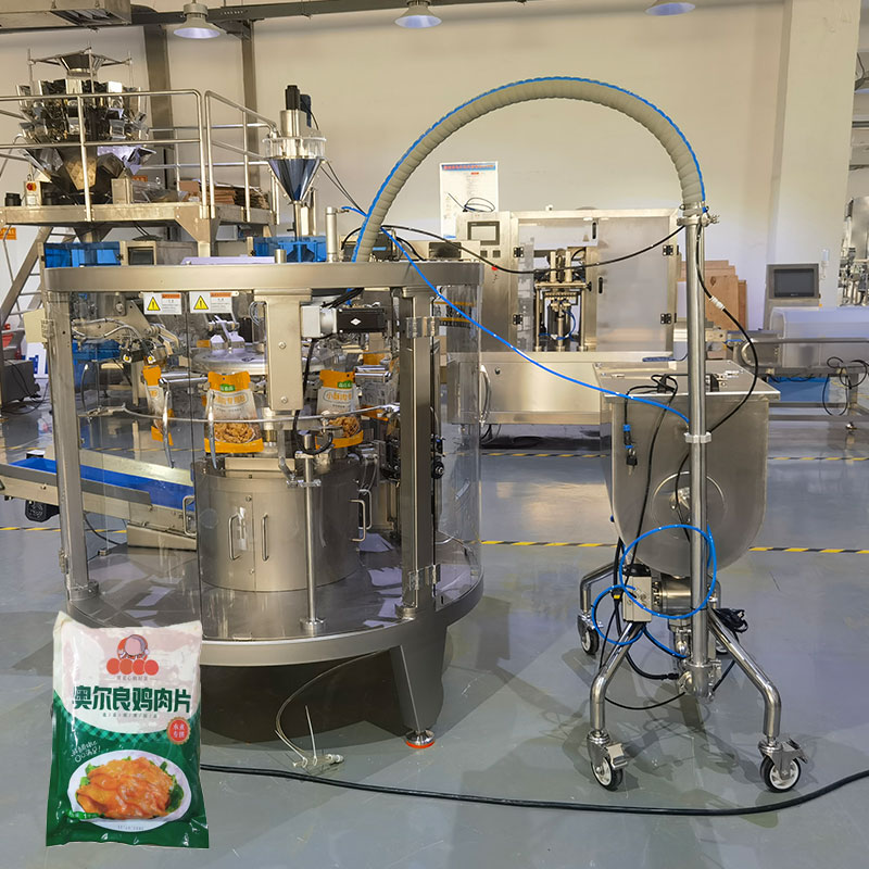 料理肉制品加工行業快速發展,奧爾良雞肉片作為主要流行商品,通過運用腌制雞肉包裝機械能夠快速完成肉類商品包裝工作的保鮮性能、衛生標準和生產效率等條件,奧爾良雞肉片包裝機通過集成化的設計,能夠一鍵式啟動執行無人化的工作模式,它以全封閉式的工作狀態,能夠完成從原材料的攪拌、制袋、機械手抓取、撐袋、定量充填、嚴密封合、日期打印、產量計數等操作工序。